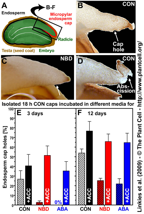 (E) and (F) Percentage of isolated caps that formed holes by 3 and 12 d, respectively. ACC promoted cap hole formation and completely reverted the inhibiting effects of NBD and 3 mM ABA when added in combination to the incubation medium of the isolated caps. Mean values ± SE from two independent experiments with five and 12 isolated caps, respectively, are presented. All incubation conditions were continuous light at 18°C. Similar results were obtained for L. sativum FR14.